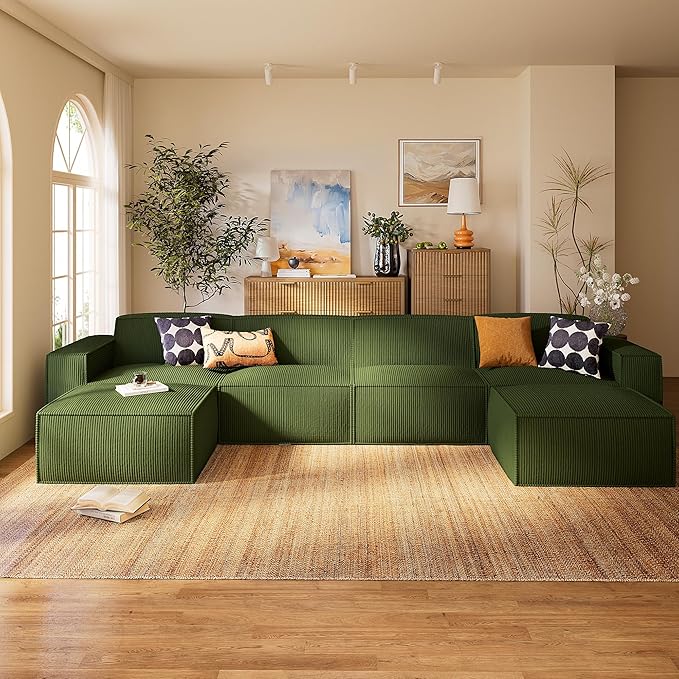 Acanva Luxury Modular Sectional Living Room Sofa Set, Modern Minimalist Style Couch with Ottoman and Chaise, U-Shape, Linen-Like Cream