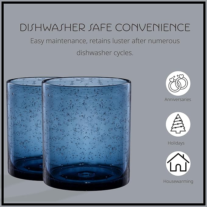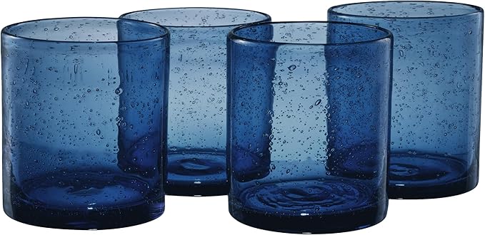 ARTLAND 14oz Double Old Fashion Glass, Set of 4 | Iris Seeded Design, Slate Blue | Drinking Glass for Parties and Everyday Use - Mojito, Whiskey, Cocktail | Glassware & Barware Essentials