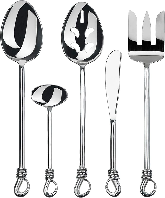 Gourmet Settings 5-Pieces Hostess Silverware Twist Collection Polished Metal Flatware Serving Set, Stainless Steel Kitchen Utensils Knife/Fork/Spoons (34-701)