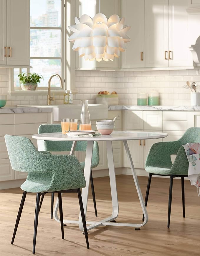 - 【High-Quality Lighting】White Flower pendant chandelier by Possini Euro Design, a great accent for mid-century modern spaces. White color panels and canopy. Lightweight resin construction.