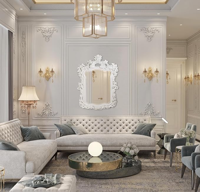 Howard Elliott Turner Large Ornate Mirror, White Ornate Mirror Beveled Edges Rectangular Vanity Mirror with Baroque Scroll Pattern for Bedroom, Living Room, Bathroom & Entryway, 56 x 42 Inch