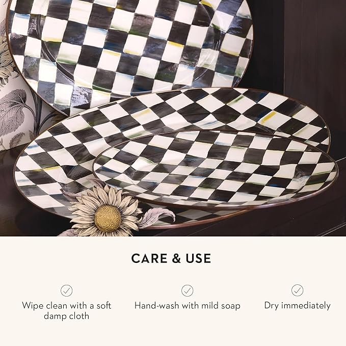 - SERVING ESSENTIAL: Serving platters for entertaining don’t get any more classic than this. Our Courtly Check platter features glossy hand-painted black-and-white checks, a hand-glazed heavy-gauge steel underbody, and a bronzed stainless-steel rim.