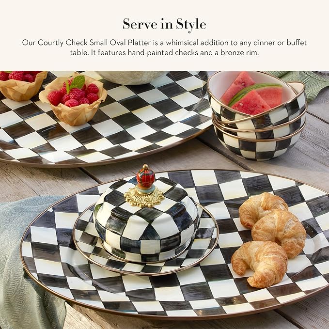 MACKENZIE-CHILDS Enamel Oval Platter, Serving Plate for Entertaining, Small, Black-and-White Courtly Check