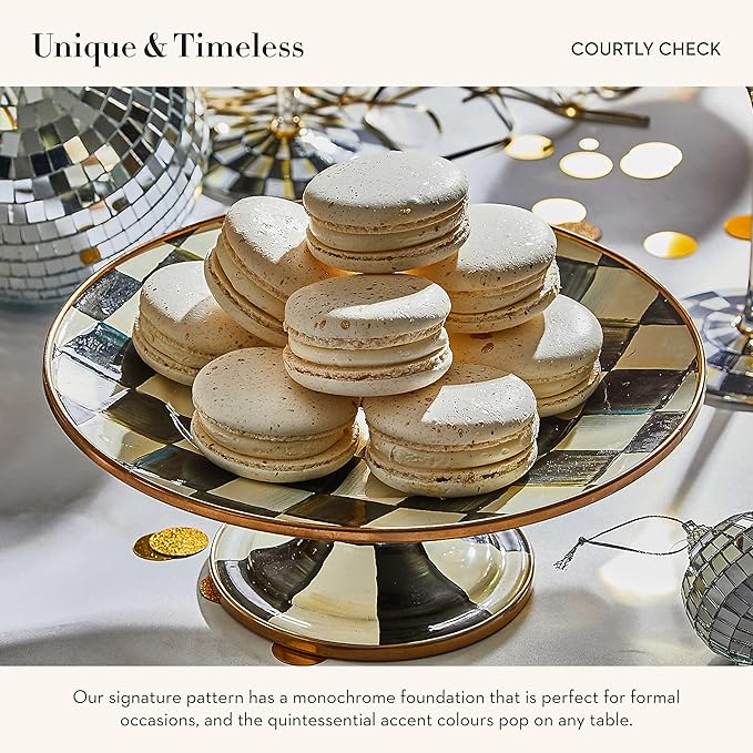MACKENZIE-CHILDS Enamel Pedestal Serving Platter, Decorative Serving Dish for Food, Mini, Black-and-White Courtly Check