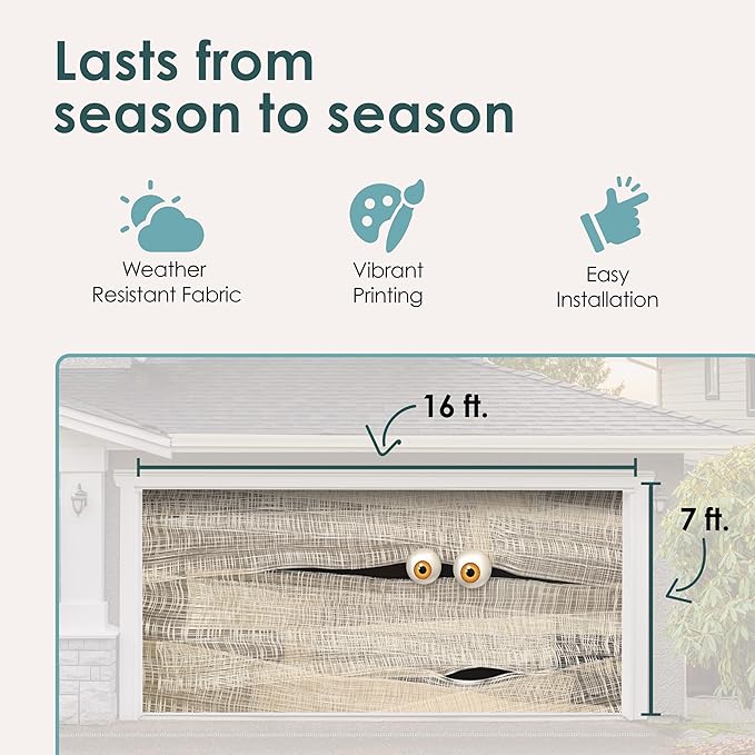 - Prepare for Spine-Chilling Thrills: Greet your guests with the eerie gaze of our 7' x 16' Mummy Garage Door Banner. This hauntingly realistic design turns your home into a terrifying tomb, setting the perfect scene for a night of Halloween scares and shivers.