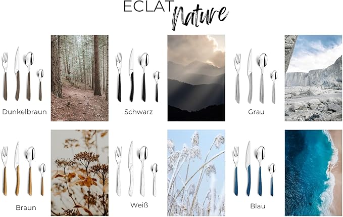 - Sophisticated Design: The Amefa Eclat Nature silverware set features a captivating faux wood handle that enhances any dining environment. Its natural wood look and polished stainless steel create a refined dining experience for every occasion