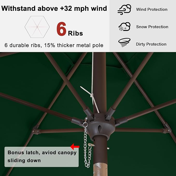 - Fiberglass Ribs: Heavy duty fiberglass ribs form a spacious top to provide strong stability. They are tougher, more elastic than iron ribs, so our outdoor umbrellas stand straight under strong wind and rain.