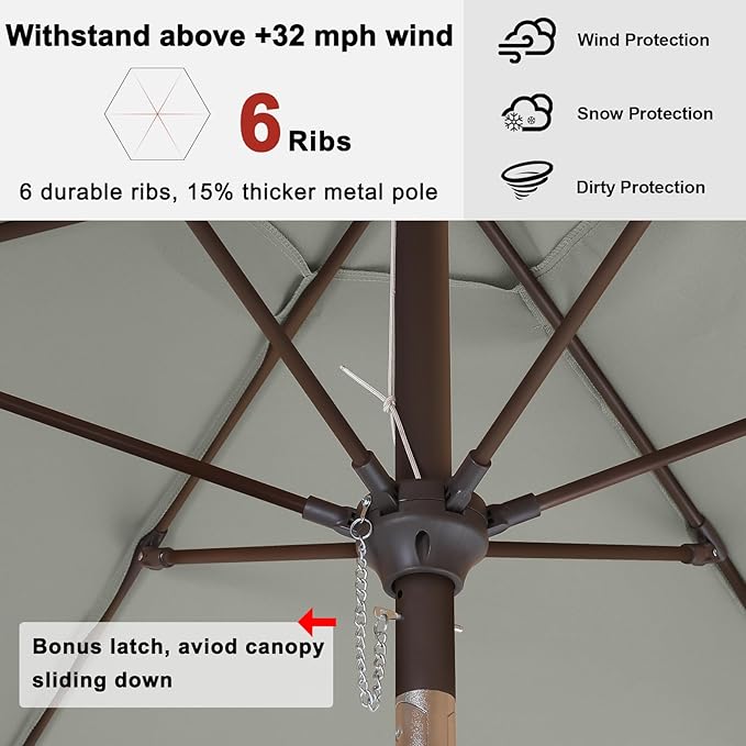 - Fiberglass Ribs: Heavy duty fiberglass ribs form a spacious top to provide strong stability. They are tougher, more elastic than iron ribs, so our outdoor umbrellas stand straight under strong wind and rain.