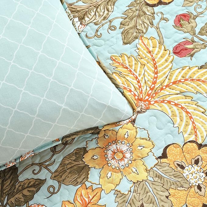- Charming Florals: Brighten your bedroom with the blooming floral pattern of the Sydney Reversible Quilt Set. This print embodies the spirit of spring with a gorgeous garden, featuring flowers and vines enriched with nostalgic colors for that homey feel.