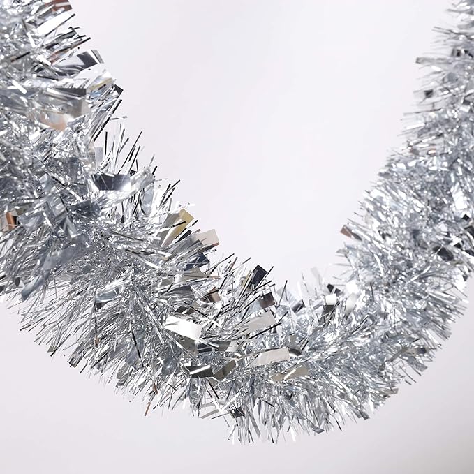 - The Silver tinsel twist garland measures 4 inch diameter by 25 foot long roll.