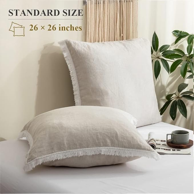 Simple&Opulence 100% Linen Euro Sham Pillow Covers Belgian Flax-Set of 2, Decorative Pillow Cover with Tassels, Boho Shabby Chic Style for Couch/Bed, Natural Linen, 26" x 26"