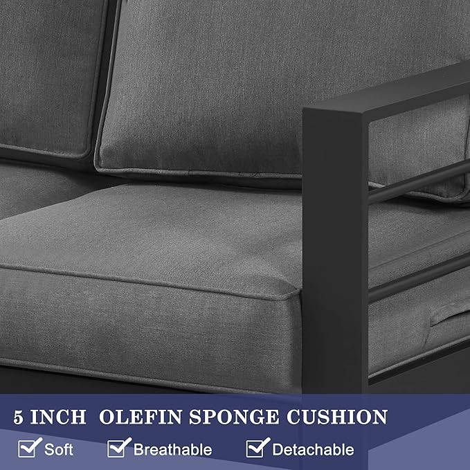 - 5-INCH OLEFIN CUSHION- Covering the top of the aluminum outdoor sofa baseplate, piped cushions provide 5-INCH padding as you sit. Thickened at the waist, the foam-filled cushions encourage proper posture while you sit. Each cushion of the patio furniture loveseat is wrapped in water-repellent OLEFIN fabric, so it's sure to stand up to UV rays beaming down when left outdoors.