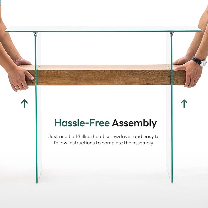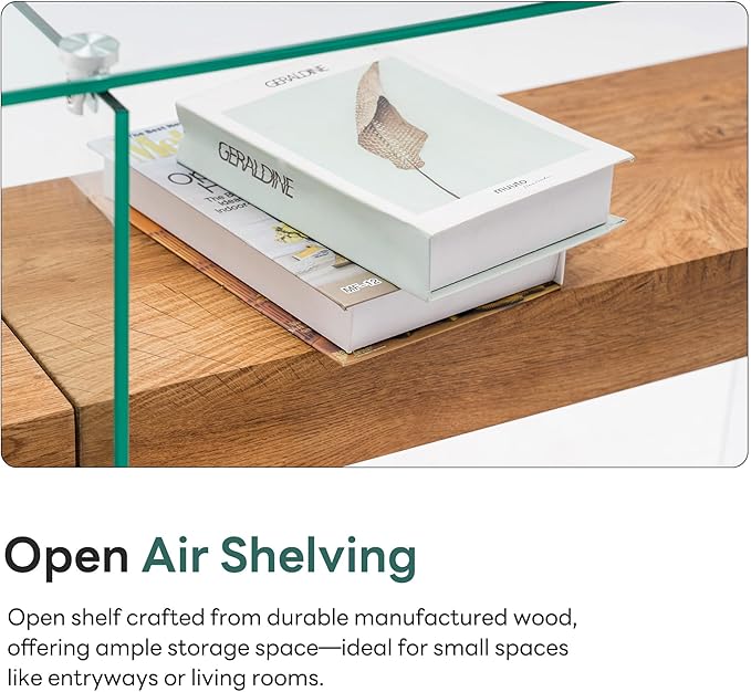 - Modern Air Console Table: Crafted with tempered glass supports and faux wood, this small entryway table creates a mesmerizing floating illusion that visually expands small spaces. The transparent base enhances natural light flow, brightening tight entryways or narrow hallways