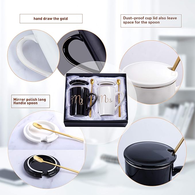 - Gift Box Packing: All you get are showing in the Pic2! Comes in Stylish Packaging with Silk-Finished Interior. This item is ready for gift giving. No need to repackage.1 x 14 oz Mr mug(Black),1 x 14 oz Mrs mug(White),2 x cup lid, 2 x spoons,1 x silk ribbon,1 x Black Greeting card(You can write down your blessings to your friends).Larger size mugs and more accessories offered,meet your further coffee drinking need or gift giving need!