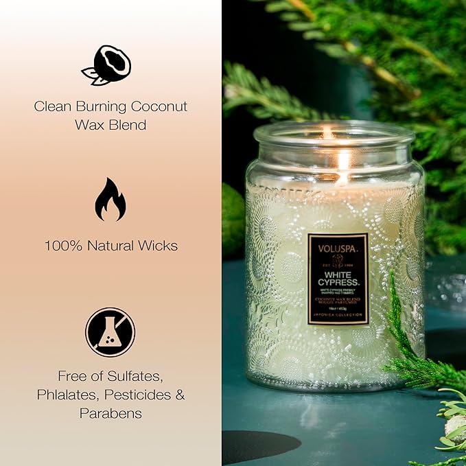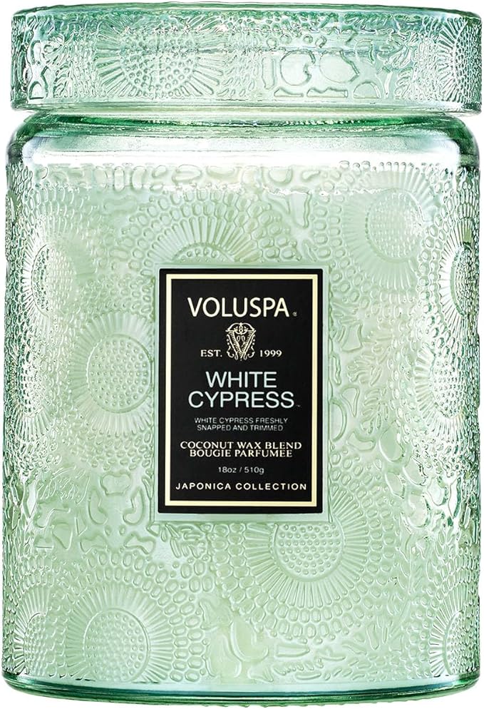 Voluspa White Cypress,Large Candle Jar,18 Ounce,100 Hour Burn Time, & Coconut Wax for Clean Burning,,Handcrafted in the USA