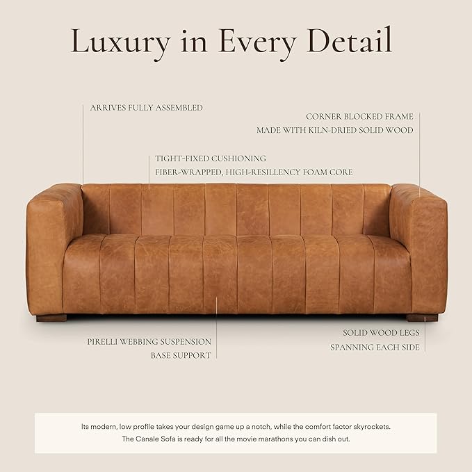 - Quality First Because Quality Lasts: Our Italian leather sofa is designed with your comfort in mind, featuring a channel tufted charmer, webbing seat support, and a high-resiliency polyurethane foam core. Its solid wood legs spanning each side of the sofa complement the cognac tan, making it an ideal office sofa or living room sofa.