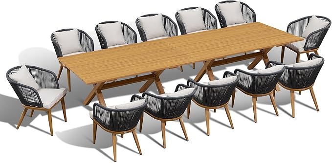PURPLE LEAF 14 Pieces Patio Dining Table Set Wicker Outdoor Furniture Rectangular Table and Chairs Set for Garden Deck Teak-Finish & Grey Aluminum Frame Backyard Kitchen Set, Cushions and Pillows Included