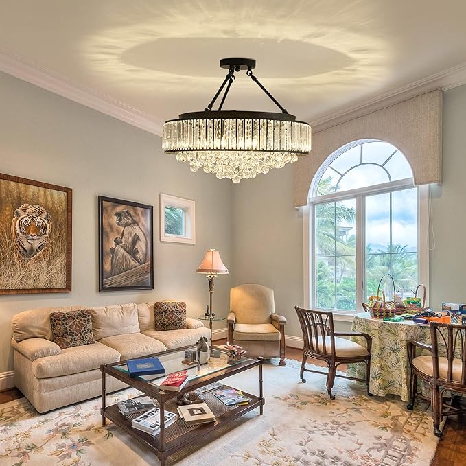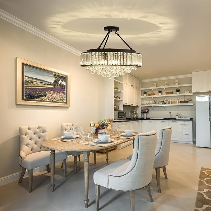 - Flush Mount Chandelier High Level Design: Shiny and Sparkling crystals could create a superior and classy atmosphere in your living room, bedroom, kitchen, dining room or study.