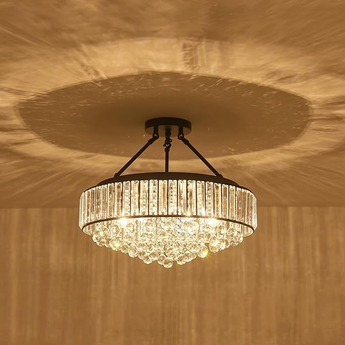 YYJLX 6-Light Modern Large Crystal Chandelier Black Metal E26 Semi Flush Mount Round Light Fixture Ceiling Lamp Farmhouse for Dining Living Room Laundry Foyer Kitchen Balcony Bedroom