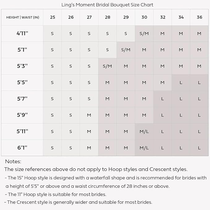 - Size: This Wedding Bouquets for Bride is approx. [13 inches W x 20 inches H]. Handle length 4.3inch. With ribbons card. This size is typically suitable for most brides to carry, this one is recommend for 4'11"-6'1"height and 25" waist, 4'11"-6'1"height and 26" waist, 4'11"-5'7"height and 27" waist, 4'11"-5'3"height and 28" waist, 4'11"-5'1"height and 29" waist, 4'11"height and 30" waist.