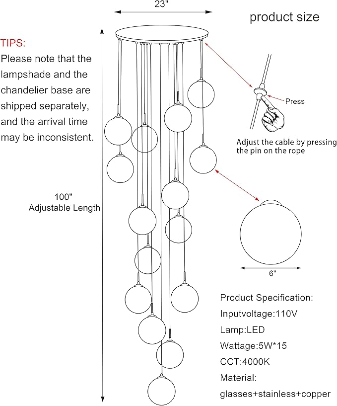 - ★ Staircase chandelier size: Up to 98 inches/250 centimeters of suspension wire, with adjustable length that can be shortened to the ceiling. Pendant base diameter: 23.6 inches/60cm, glass ball diameter: 6 inches/15cm. Applicable area: 10-15 ㎡. The pendant lamp does not support dimming, and the fixed color temperature of the light source is 4000K.