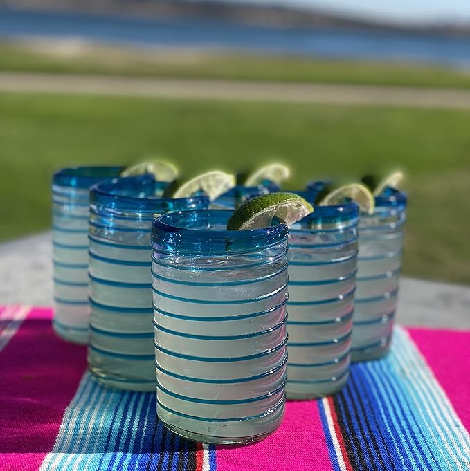 Hand Blown Mexican Drinking Glasses – Set of 6 Glasses with an Aqua Spiral Design (14 oz each) …
