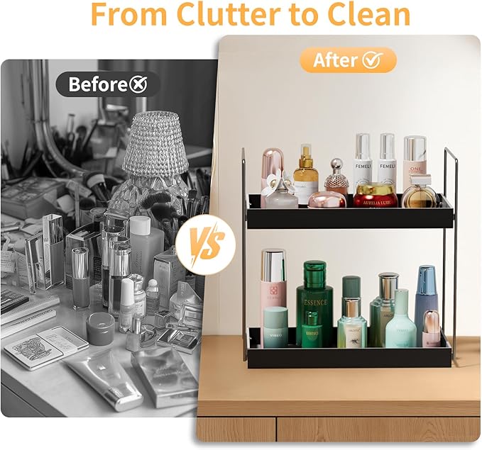 - [OPEN AND CLASSIFIED STORAGE] This bathroom countertop organizer shelf is open, 2-tier design, no need to pull closed, different types of items are classified and stored in different tiers, all items are clear at a glance, no more confusing items.