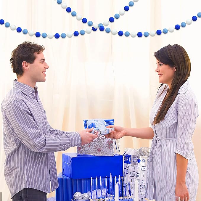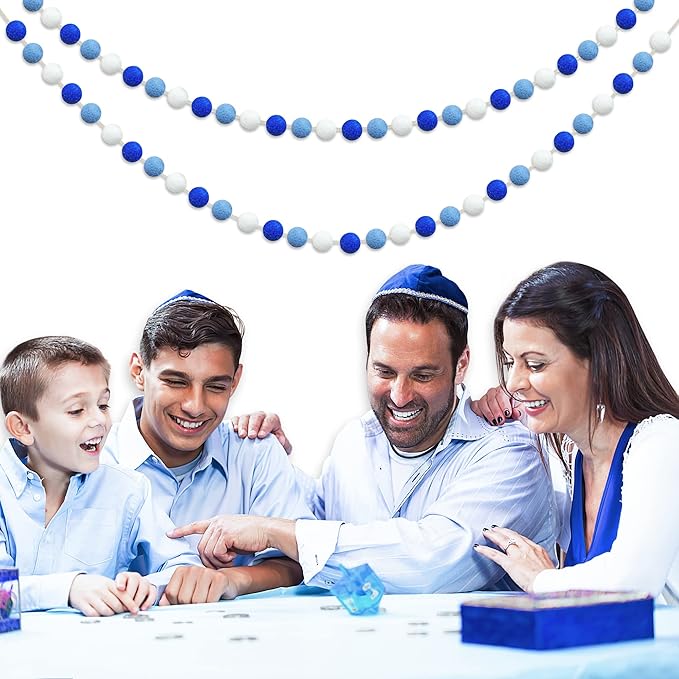 - HANUKKAH FELT BALL GARLANDS -- The package comes with 2 strands of felt ball garlands, each garland has 30 felt balls, total 60pcs balls. These lovely felt ball garlands are combination of blue felt ball, dark blue felt balls and white felt balls, which will really brighten up your Chanukah decorations and add more festive atmosphere to your party.