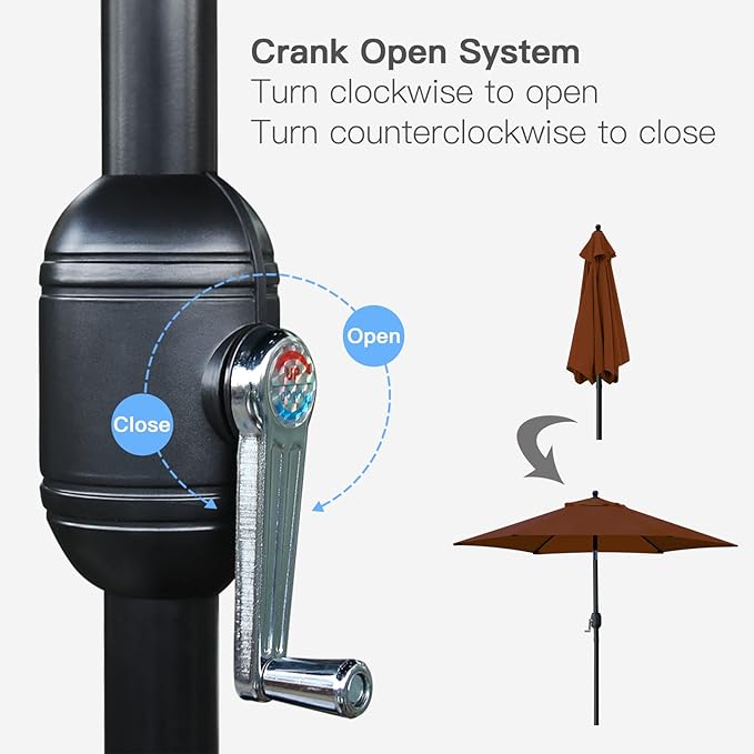 - PUSH BUTTON TILT FOR MORE ANGLES- Tilt with push button for more angles of shading, crank handle for easy opening and closing, air vented at the top, cool and can withstand sudden gust.