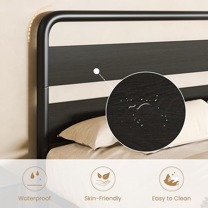SHA CERLIN Queen Size Metal Bed Frame with Wooden Headboard and Footboard, Heavy Duty Oval-Shaped Platform Bed with Under-Bed Storage, Noise Free, No Box Spring Needed, Black