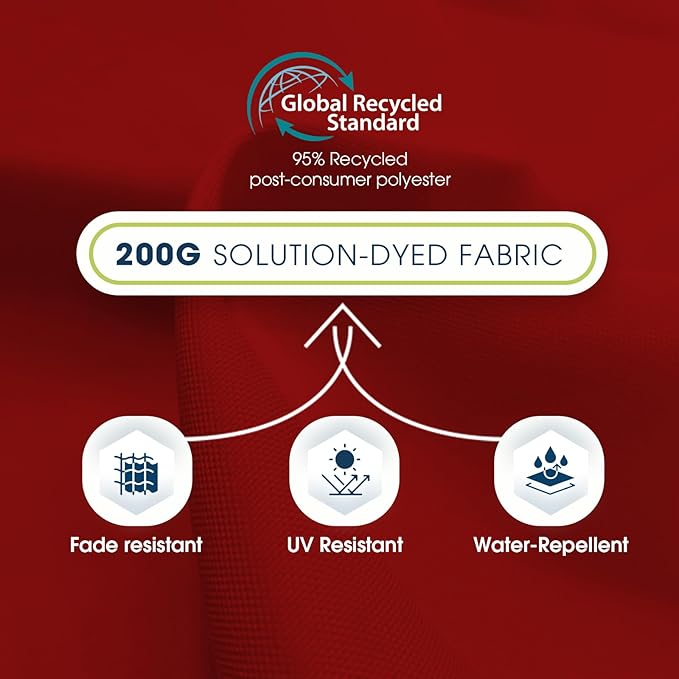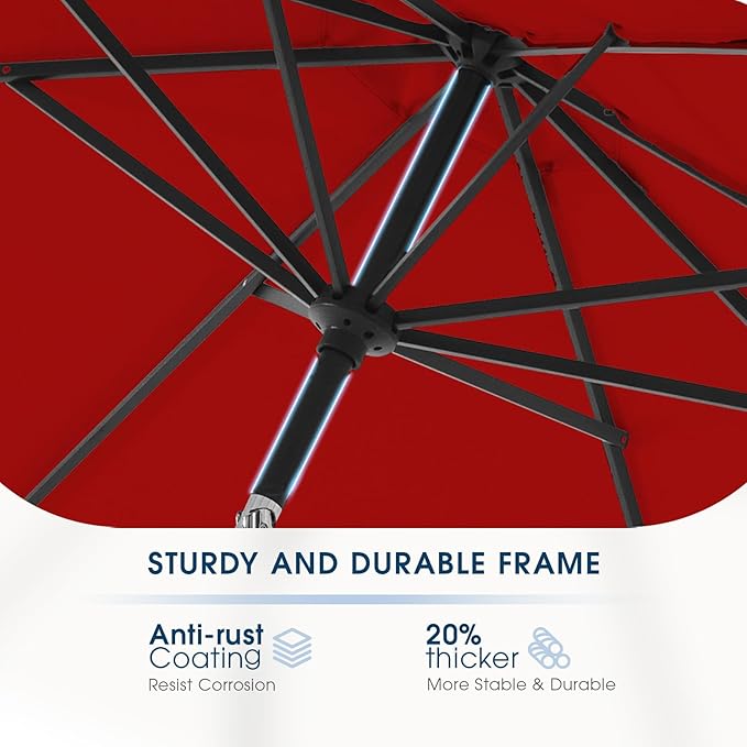 - UPGRADED ECO-FRIENDLY &RECYCLED FABRIC: This maket umbrella has a GRS certified canopy that is made of recycled Polyester Draw-Texturing-Yarn. This PU coated canopy has a US Standard AATCC 16 Grade 5 colorfastness to light, the thick high quality material provides excellent UV resistance, water proofing and fade resistance.