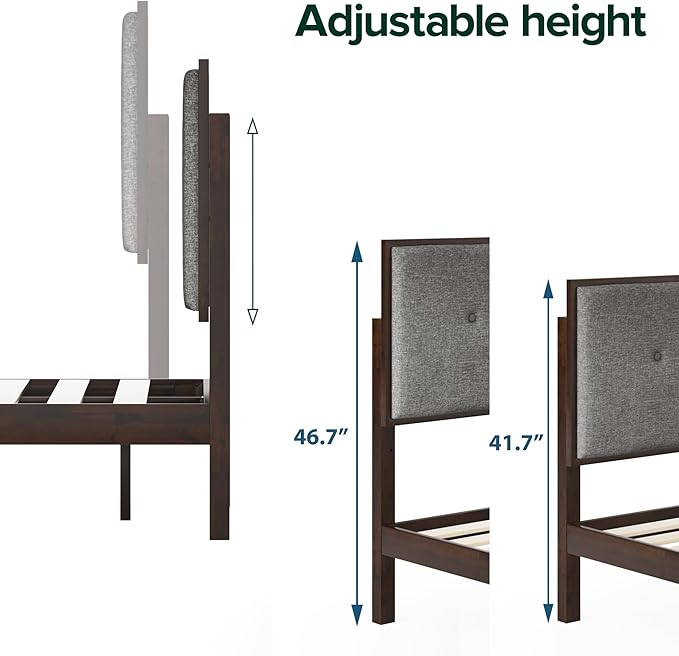 - ADJUSTABLE HEADBOARD HEIGHT - Headboard can be adjusted during assembly to 41.7 or 46.7 inches high to suit the thickness of your mattress.DURABLY CRAFTED - A durable wood frame is built solid with a center support beam that holds up to years of daily use
