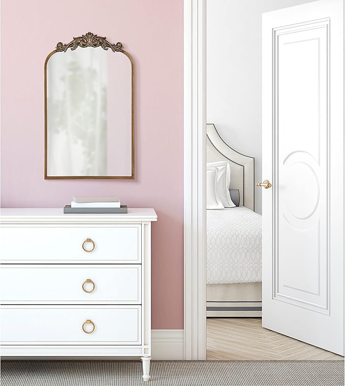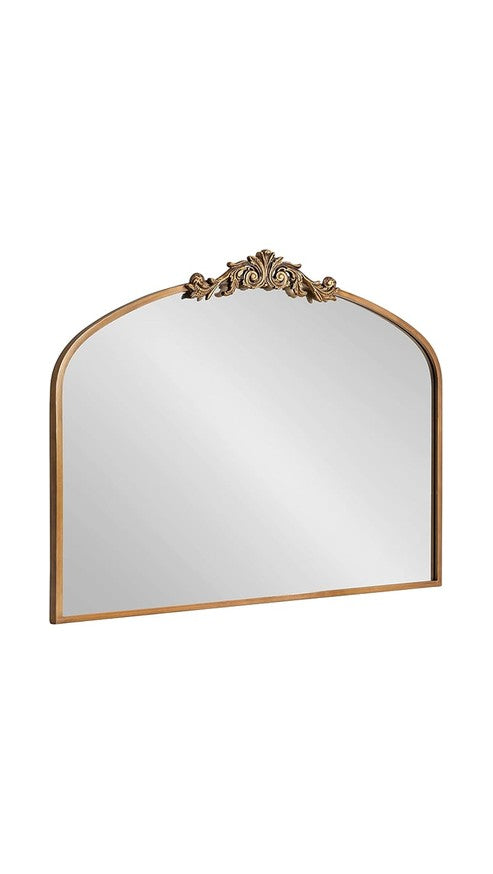- Gold Ornate Mirror: This elegant wall mirror features an ornate, baroque-inspired frame with a trendy arched frame and an ornamental cascading garland crown