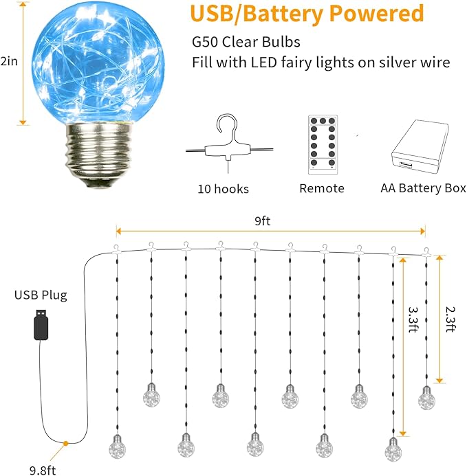 - [ 9.8x3.3 ft ] Wishing Ball Curtain Lights: The edison look bulbs are filled with fairy-like copper wire LEDs, hanging on silver wire curtain lights, to create a soft mode for just any place, add charm and character to your activities and provide relaxing mood lighting for party