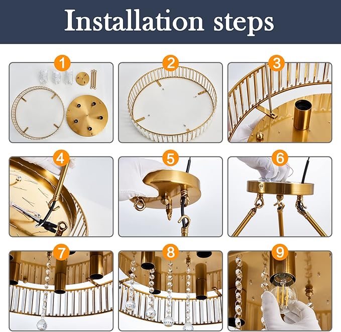 - Ceiling Lamp Installation: Assembly required (include hanging the crystal strings to the plate), but easy to install and all mounting hardware and a detailed mounting instructional manual included.