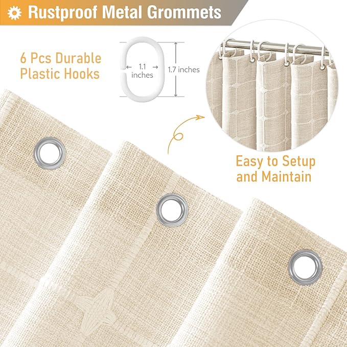 - 🛁【Dimensions】: W36xH72 inches(The tassel length is not included); ❤️The tassel brings 1.4 inches of additional length❤️; Package includes 1 cream shower curtain and ★6 Plastic Hooks★; Various sizes shower curtains meet most bathtubs and shower stalls need. This farmhouse shower curtain is perfect for apartment, hotel, spa, camper, RV, dorm, school shower, athletic club, gym and everywhere else you need a shower curtain.