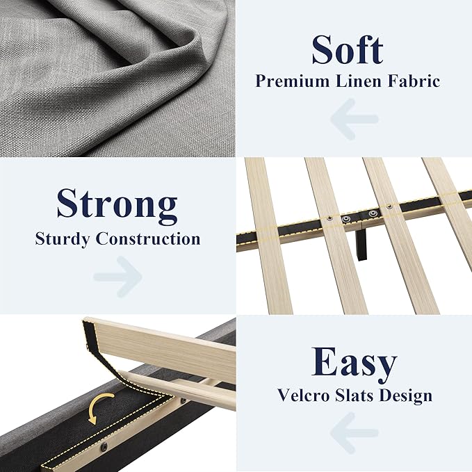 - All-Match Style & Comfort: The bed frame is made from high-quality linen fabric, giving it a sleek appearance. With a straightforward yet sophisticated design that complements various bedroom styles.
