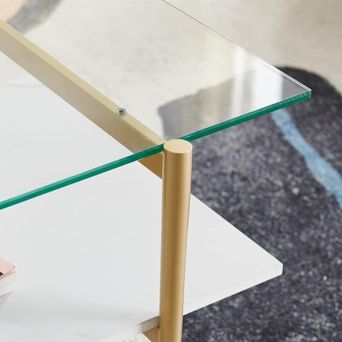 - High-quality Materials: A clear glass tabletop, a white marble finished wooden shelf, and a steel frame with a stunning gold finish, make this coffee table not only sturdy and durable but also elegant and stylish. The steel frame provides excellent stability while the clear glass top and white marble finished wooden shelf add a touch of sophistication and luxury to your living space.