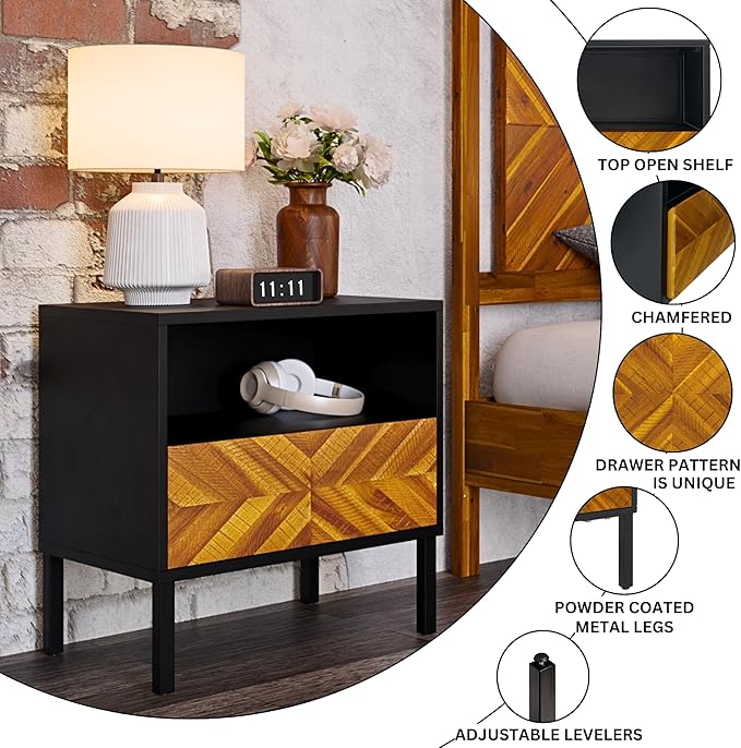 - ERGONOMIC DESIGN: With features like an open shelf for easy access storage and one large sliding drawer for your bits and pieces is an exquisite design with large space, no handle, very distinctive 45-degree cut edge, and damping; This multi-function antique nightstand, brown wood nightstands, accent end table natural wood will seduce you out of your socks; Besides, the legs are tall and equipped with adjustable plastic levelsers, helps to get perfect flatness on uneven floors, and the robot vacuum cleaner can easily go through underside for cleaning