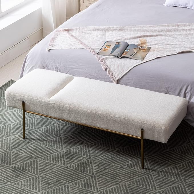 Modern End of Bed Bench, Upholstered Entryway Bench with Detachable Pillow for Living Room, Faux Fur Ottoman Bench with Gold Metal Legs, Comfy Cushion Bedroom Decoration Benches (White)