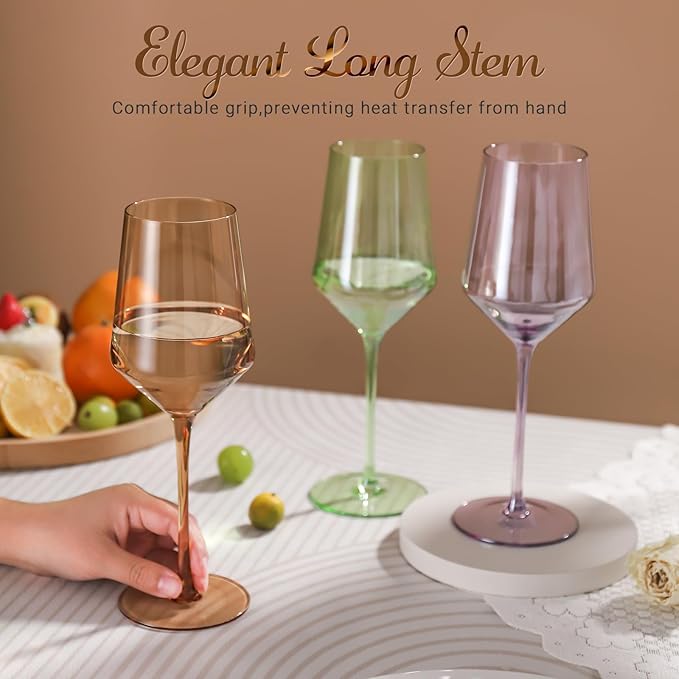 - 【Crystal Wine Glasses with Multi Color, Premium Quality Materials】Crystal colored wine glasses made of 100% lead-free crystal. Crystal wine glasses is ultra-transparent, pure, bright that refract light which highlights the natural hue and viscosity of your wine .What’s more, the material is easy to wash, dishwasher safe for easy daily maintenance and preserve its gorgeous shine.