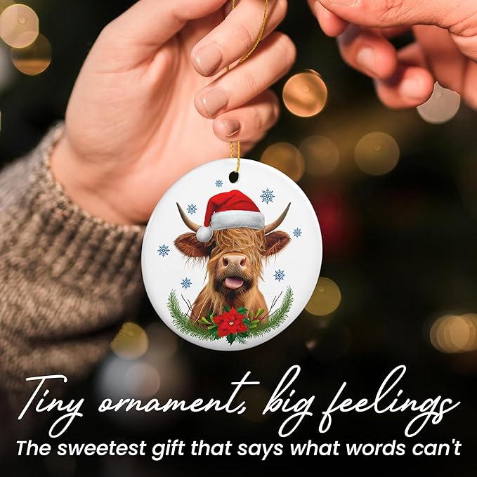 OASSIE Highland Cow Christmas Ornaments Gifts for Women Men - Ceramic Ornaments 2025 for Tree Decorations - Cow Ornament for Farmhouse Decorations, Hanging Ornament for Rustic Tree, Farm Animal Gifts