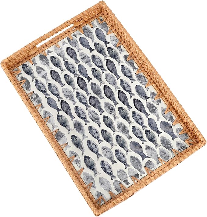 Rectangle Rattan Tray with Mother of Pearl Inlay, Rattan Serving Tray with Handle for Coffee, Bread, Fruits, Snacks, Decorative Wicker Tray for Table Decor (Rectangle Dark Blue Fish, 13"×9")