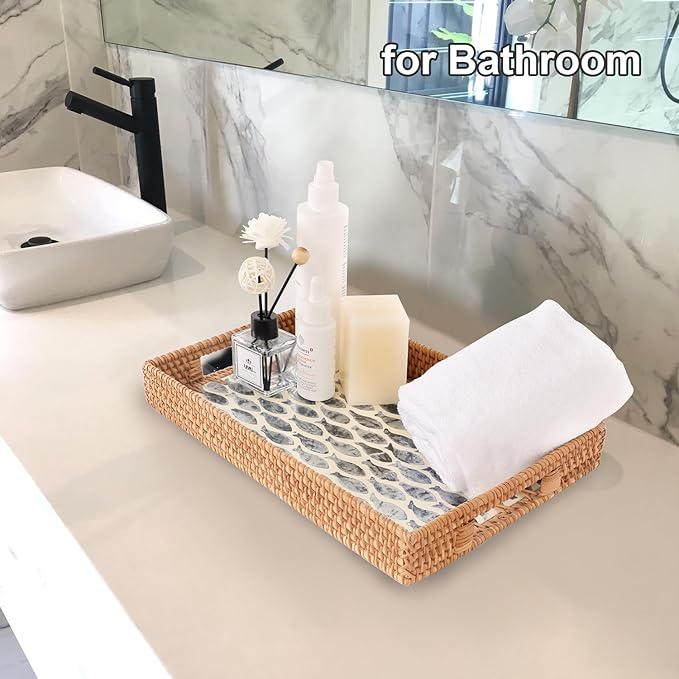 - ★Handwoven Natural Rattan Tray: This rattan tray is hand-woven from rattan, with strong wood core. The mother of pearl inlay on the surface with a glossy lacquer, only need wipe this tray with a damp cloth to clean it