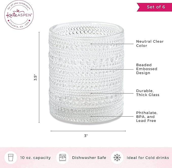 Kate Aspen Beaded Drinking Glasses Set of 6, 10 oz Retro Vintage Glassware - Boho Cocktail Water Juice Glasses, Hostess or Housewarming Gift