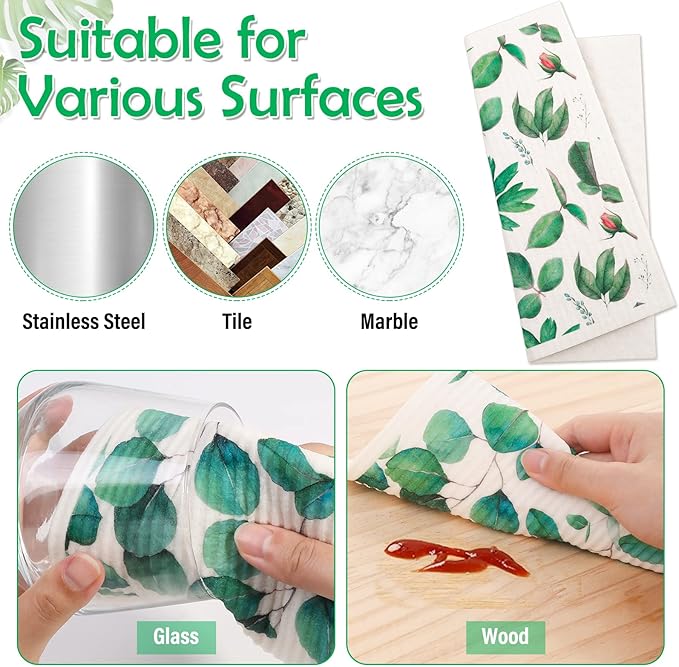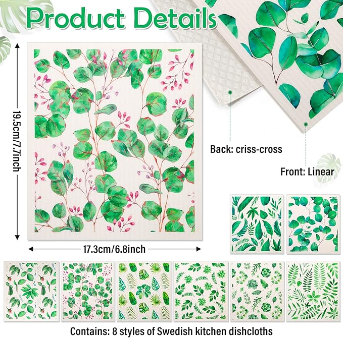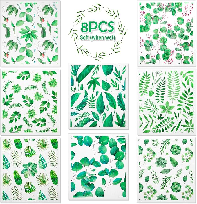 - 𝐒𝐰𝐞𝐝𝐢𝐬𝐡 𝐃𝐢𝐬𝐡 𝐂𝐥𝐨𝐭𝐡𝐬 𝐒𝐞𝐭 Swedish Kitchen dish cloths include 8 green patterns, which are printed with leaves for distinguish various use and matching home décor. Each of kitchen towels is 20 x 18 cm/ 8 x 7 inches, maximize drawer space and use this to wipe our counters stove, clean up house spills and easy to throw in washing machine for quick disinfecting.