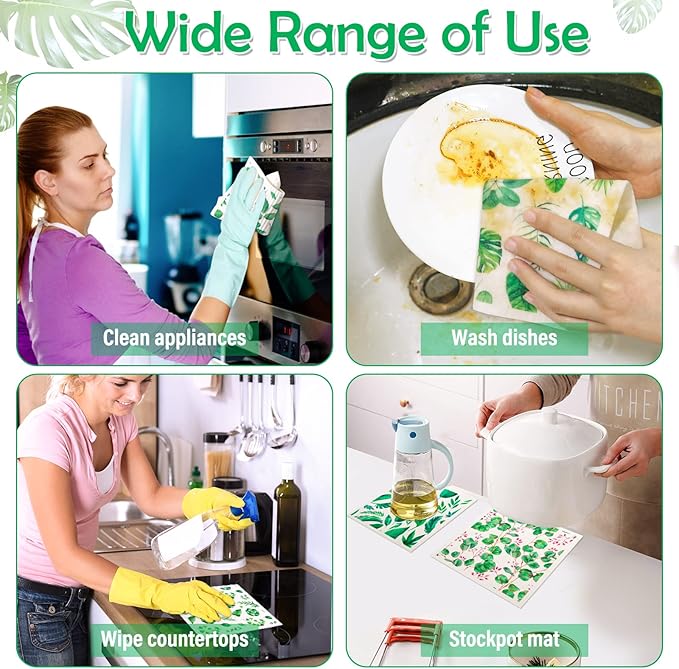 - 𝐑𝐞𝐮𝐬𝐚𝐛𝐥𝐞 𝐊𝐢𝐭𝐜𝐡𝐞𝐧 𝐃𝐢𝐬𝐡 𝐑𝐚𝐠𝐬 Made from Wood Pulp + Cotton, breathable and washable, these reusable cloths/ sponges/ towels soak up much more than a regular towel dishrag which will not leave streaks on the countertops, and they soak up stuff like flour much more easily than a traditional rag, great absorbance, soft smooth enough not to scratch surfaces but strong enough to get up grease and crumbs.