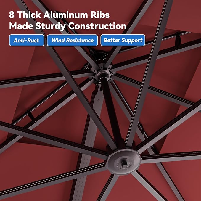 - Heavy Duty and Solid: The Large offset umbrella made of all-aluminum bones and 8 heavy-duty ribs. Cantilever umbrella surface has anti-oxidation spray paint. Make the umbrella rust-proof and maintain a long period life. We recommend using this heavy duty outdoor umbrella when the wind is below 15 mph. If the wind speed is too fast, please close the umbrella to prevent excessive resistance and topple over.