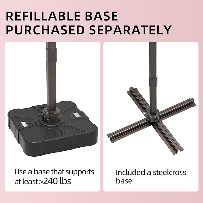 - Assembly Instruction & Tips: The umbrella come with a steel cross base but does NOT include the fillable base shown in the picture. We recommend a fillable base over 220lbs counterweights for safe and stable in outdoor use. You may refer to the installation video we uploaded in the details page. The installation is relatively simple, but since it is a large and heavy duty umbrella, so it's better for two people to work together to carry and install.