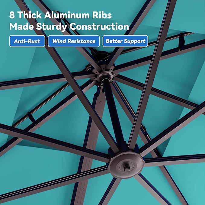 - Double Top Design: The 10*13ft rectangle cantilever umbrellas are made of upgraded high quality 240/gsm yarn-dyed polyester fabric with PU coating. It has excellent water-repellent and fadeless. The double top vent design allows the circulation of air to promotes airflow while adding stability.